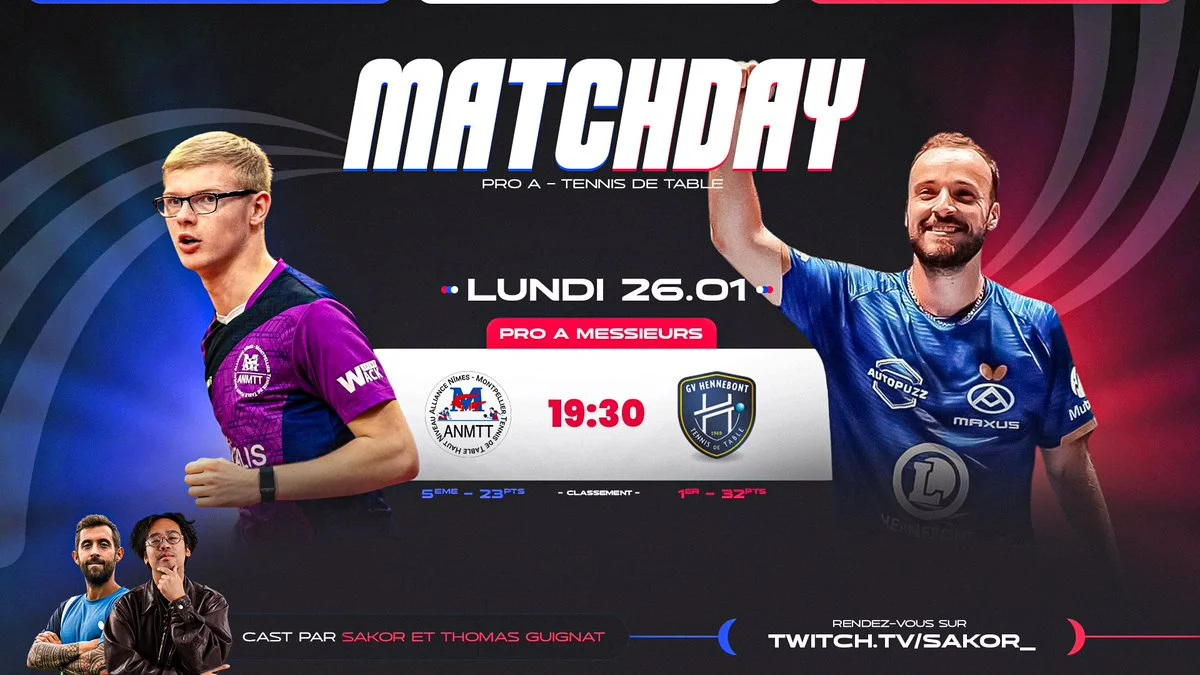 Match de tennis de table Pro A mettant aux prises l'ANMTT et Hennebont. Thomas Guignat, figure de proue de la discipline, assurera le commentaire de la rencontre en direct avec Sakor.Dónde ver
