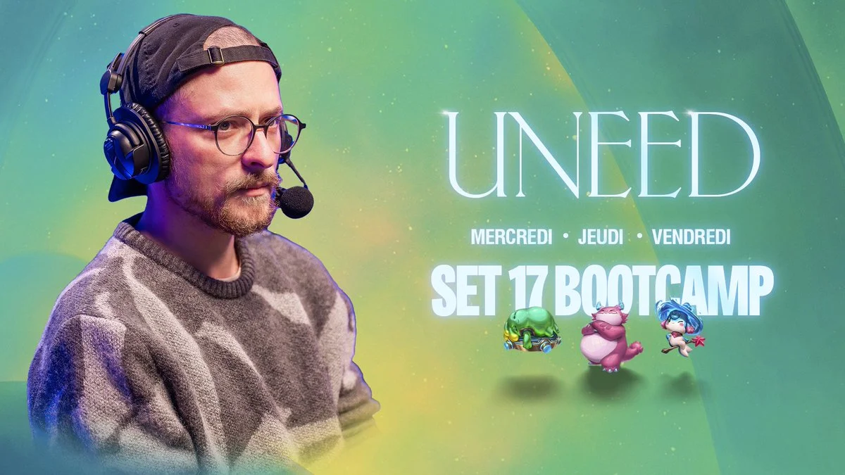 Bootcamp de trois jours organisé par Uneed, streamer spécialisé dans TFT. L'événement se déroule mercredi, jeudi et vendredi avec le Set 17 TFT.Dónde ver