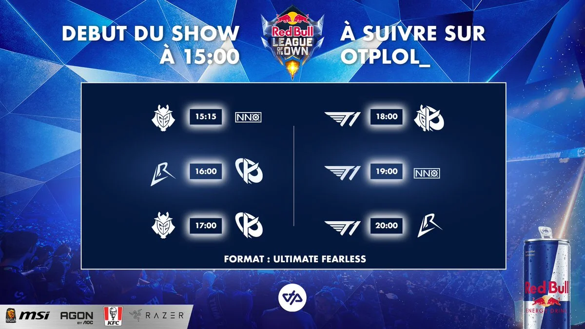 Red Bull League of Its Own est de retour. Au programme : six matchs sur le format Ultimate Fearless, avec des équipes s'affrontant à différents horaires. Le show débute à 15h00 et se poursuit jusqu'en fin de soirée. À suivre en direct sur OTPLOL.Dónde ver