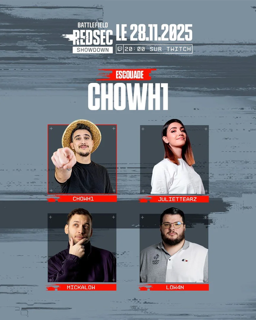 CHOWH1 forme une escouade avec Mickalow, Juliette_arz et LowAn pour le Battlefield REDSEC Showdown. Un événement officiel Battlefield où les équipes s'affrontent pour décrocher le titre de "Lord of Battlefield".Where to watch