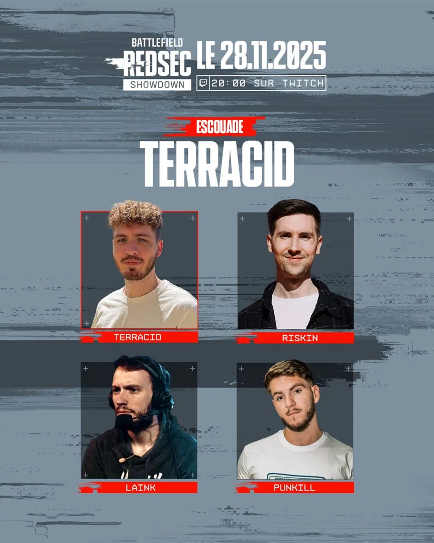 Battlefield REDSEC Showdown débarque en tournoi communautaire en direct depuis l'Espot. L'escouade de Terracid réunit Laink, Riskin et Punkill pour une soirée Battlefield.Where to watch