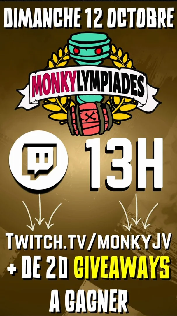 Les MonkyLympiades débarquent sur Twitch ! Un événement gaming centré sur Sea of Thieves où les spectateurs peuvent participer à des mini-jeux interactifs pour remporter de nombreux lots exclusifs. Au programme : cabestans, barres, pistolets, 6-packs Obsi, armes et blasons Gilded Phoenix, navires, Plunder Passes, et les convoitées voiles Serpent's Lie.
