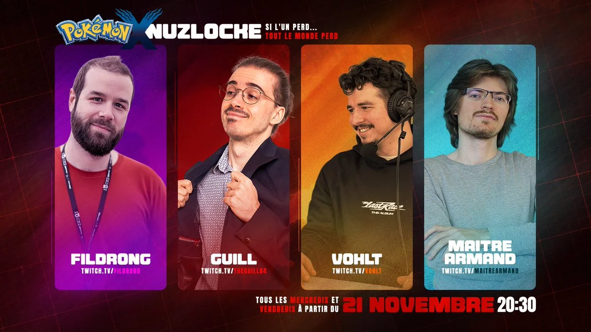 Un nouveau concept Pokémon Nuzlocke réunissant quatre streamers : Guill, Fildrong, Vohlt et Maitre Armand. Le format est simple, si l’un perd, tout le monde perd. L'événement démarrera le 21 Novembre en direct sur Twitch et YouTube, puis se poursuivra tous les mercredis et vendredis en soirée. À suivre sur les chaînes respectives des quatre participants.Where to watch