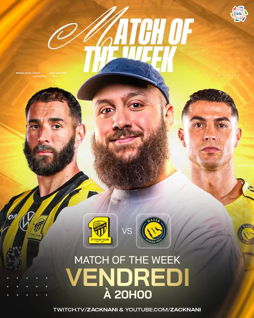 Retrouve le match of the week sur la chaine de Zack Nani ! Quatrième journée de RSL/SPL pour la rencontre Al Ittihad VS Al Nassr.