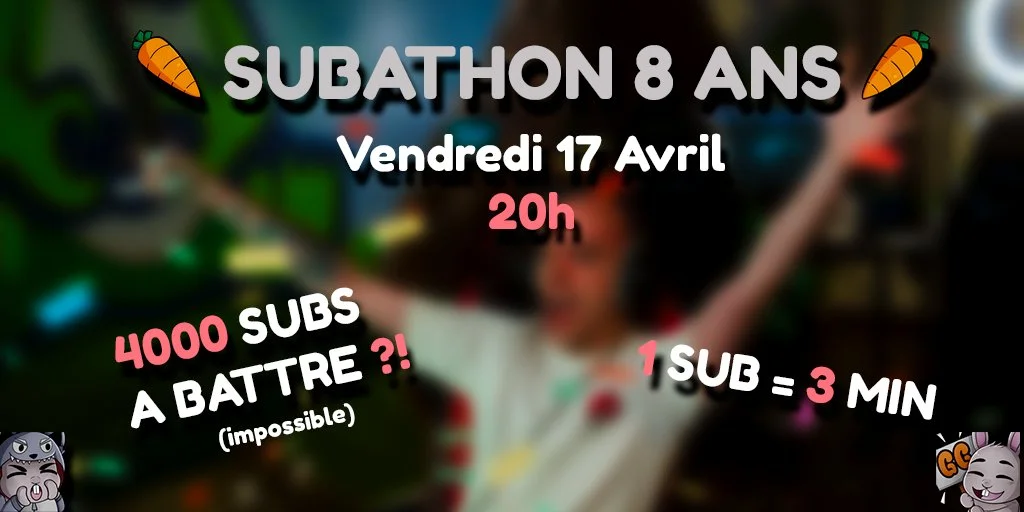 Un subathon spécial organisé vendredi 17 avril à 20h pour célébrer les 8 ans de la chaine. Le concept : chaque sub = 3 minutes ajoutées au stream. L'objectif serait de réunir 4000 subs.Where to watch