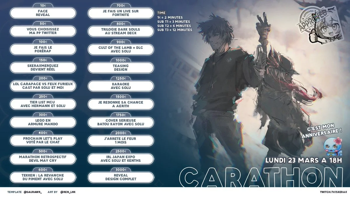 Skerax lance un carathon (marathon) pour célébrer son anniversaire et financer la création d'un vrai modèle OC pour sa chaîne. Les gains collectés aideront directement à financer les projets du streamer.Où regarder