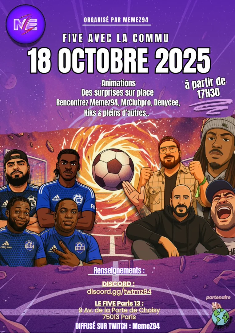 Meme94 organise sa première rencontre physique avec sa communauté autour d'un tournoi de football à 5. L'événement réunit 8 équipes sur 2 terrains, avec la participation de plusieurs streameurs comme MrClubPro, Dennycee et Kiks qui amèneront chacun leur équipe.