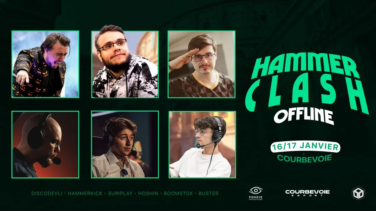 Hammerclash Offline est un événement Esport sur Overwatch 2 qui se déroule sur deux jours. Six casters pour vous faire vivre la compétition en direct : DiscoDevli, HammerKick, Alex Suriplay, Hoshin, Boomstox et Buster assureront la couverture complète de l'événement sur la chaîne principale.