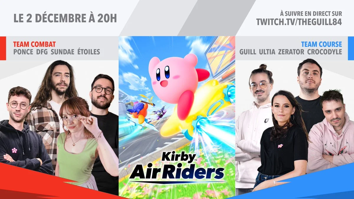 Match 4vs4 sur Kirby Air Riders réunissant deux équipes : Team Combat (Ponce, DFG, Sundae, Étoiles) face à Team Course (Guill, Ultia, Zerator, Crocodyle). L'événement sera diffusé en direct sur Twitch.Où regarder