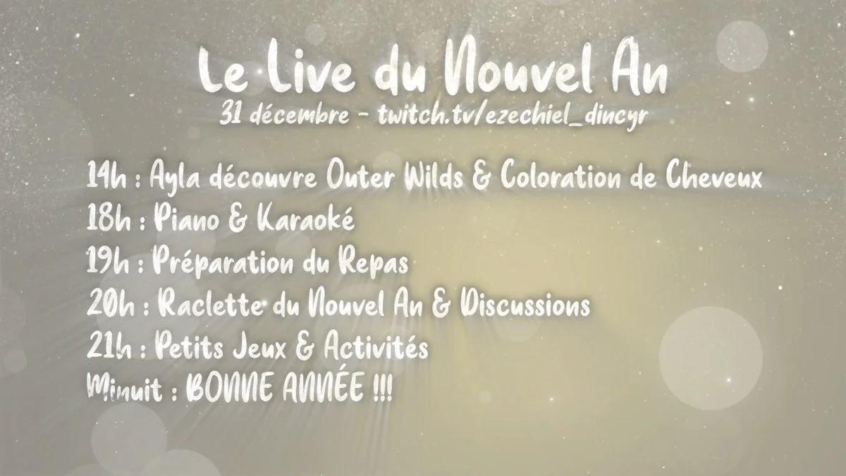 Soirée en direct le 31 décembre pour accueillir minuit en compagnie d'Ezéchiel, LaraDeaudouce, Padabill et Ayla. Le programme démarre à 14h avec plusieurs activités : découverte d'Outer Wilds et coloration de cheveux à 14h, piano et karaoké à 18h, préparation du repas à 19h, raclette du Nouvel An et discussions à 20h, puis petits jeux et activités à 21h avant le compte à rebours de minuit.Où regarder