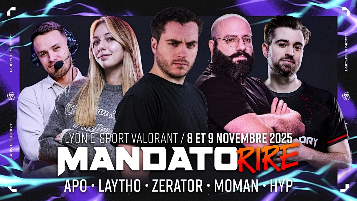 MANDATORIRE fait son retour à Lyon E-Sport ! Cet événement Valorant réunit APO, Laytho, Zerator, Moman et Hyp pour deux jours de compétition les 8 et 9 novembre 2025.