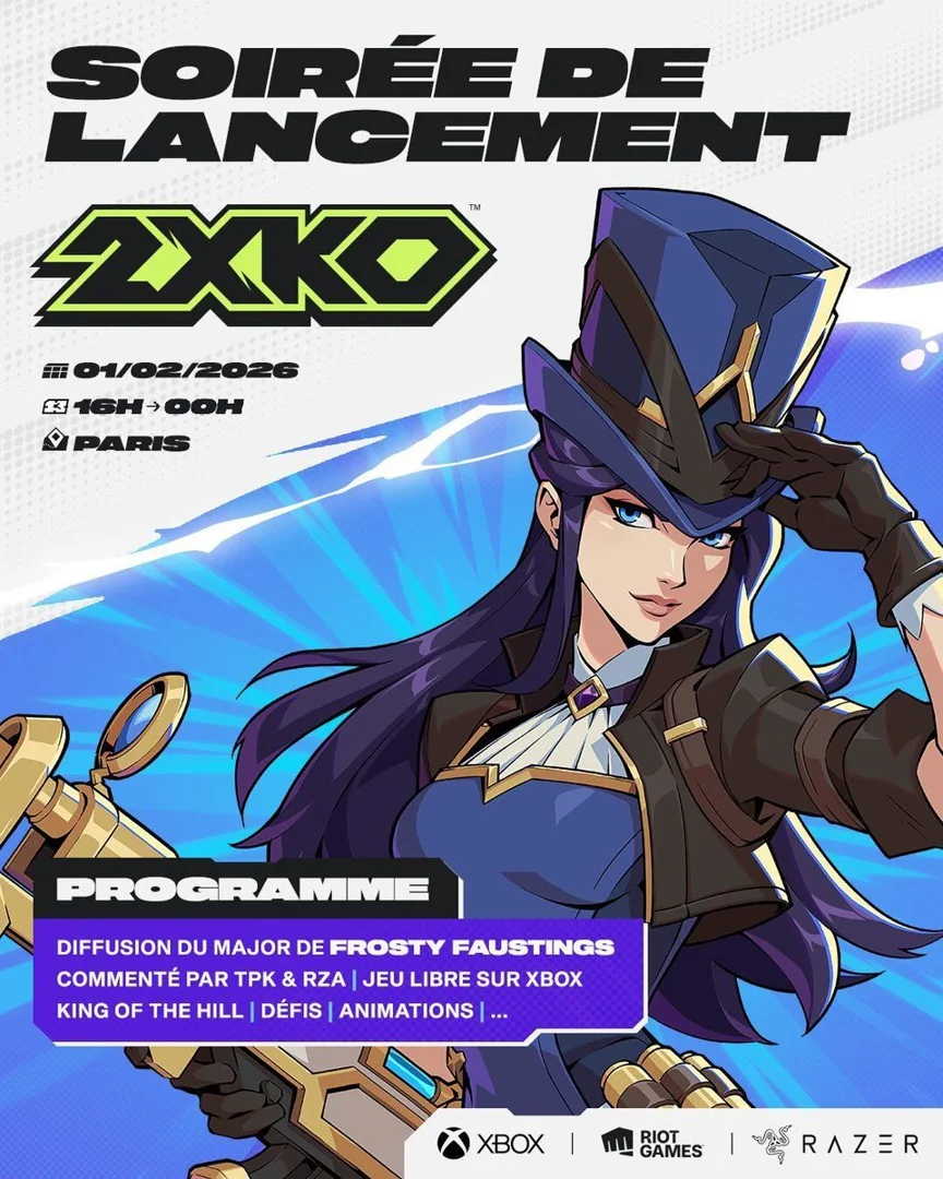 Soirée de lancement officielle de 2XKO le 1er février à Paris. Au programme : un buffet, des set-ups dédiés au jeu et la retransmission en direct du 1er Major 2XKO de 2026 aux États-Unis commentée par TPK et RZA.Où regarder